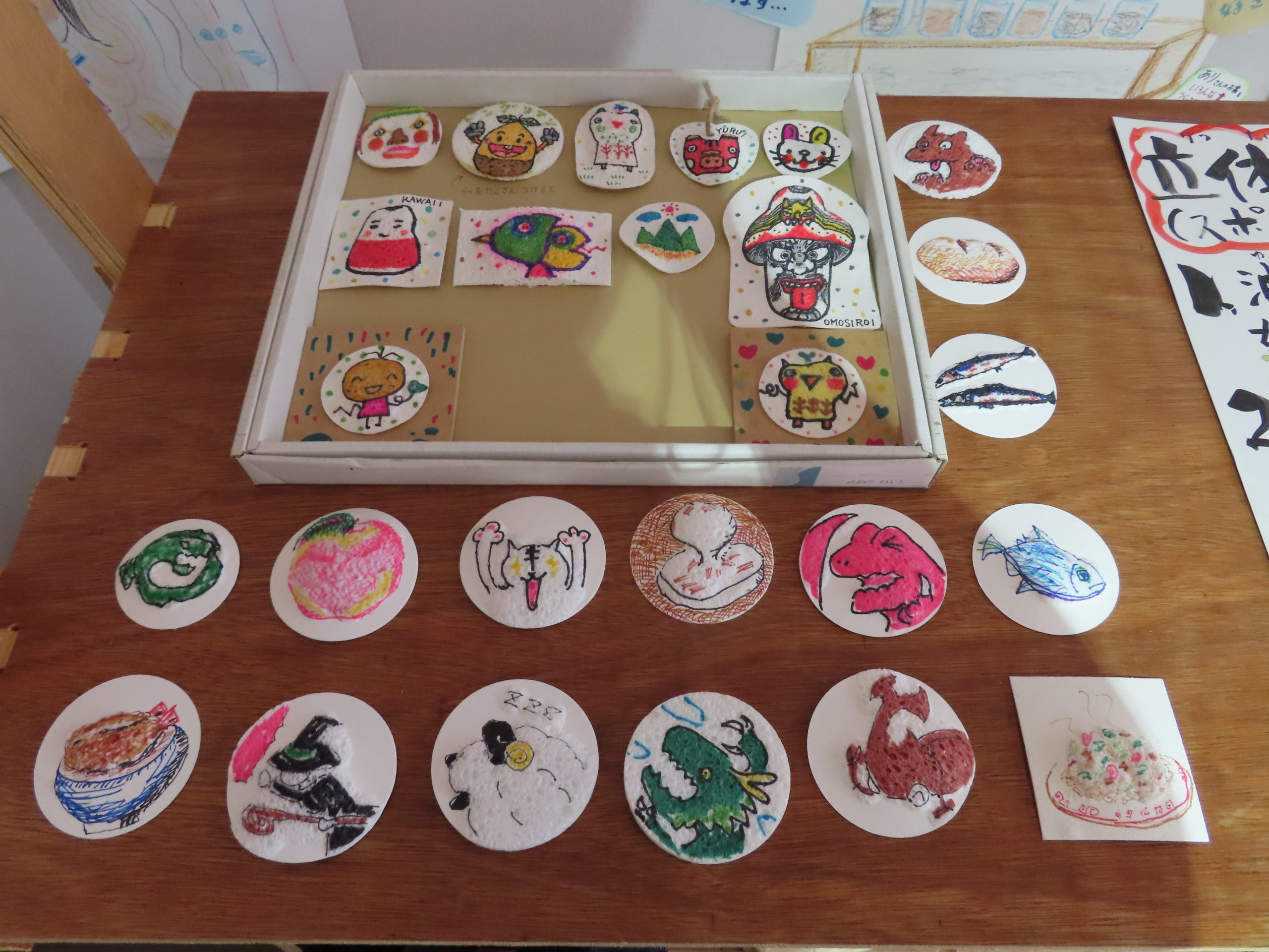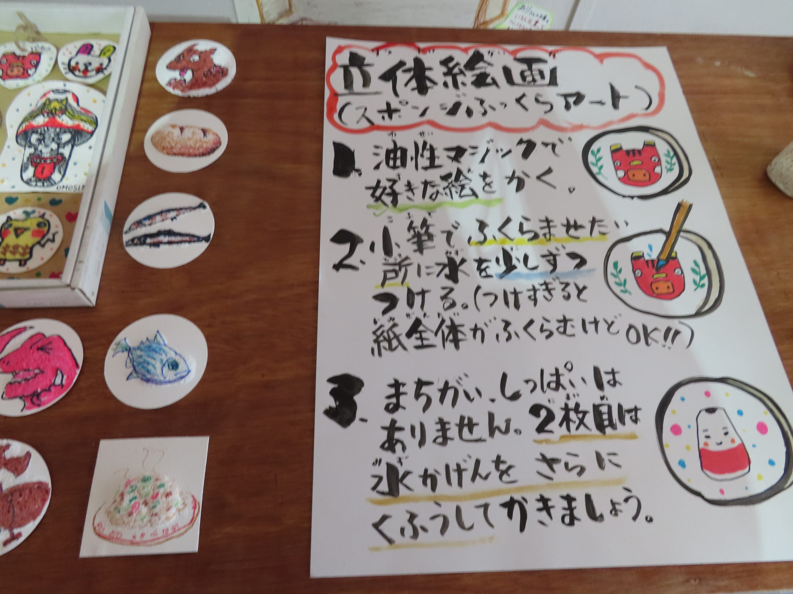水を含むと膨らむスポンジをキャンバスにして、自分の描いた絵の好きな部分をふっくら立体的に表現してみる作品制作です。